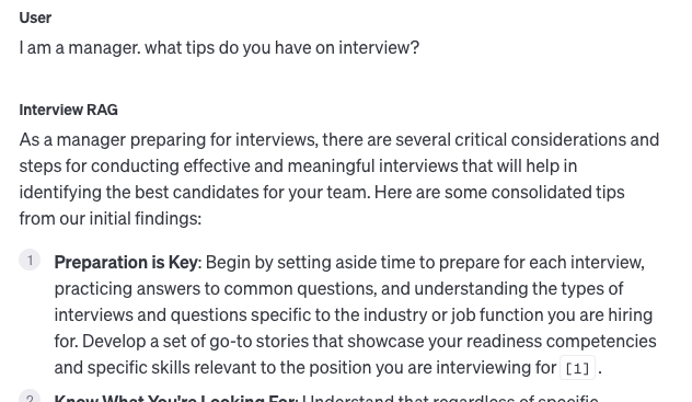 For this blog post, we conducted a small experiment using OpenAI’s assistants, which feature built-in RAG capabilities. We uploaded two documents into the RAG’s database: one was a manager’s guide to interviewing candidates, and the other, a guide for employees or students preparing for interviews. These documents present a unique challenge because they cover the same topic but cater to different audiences.